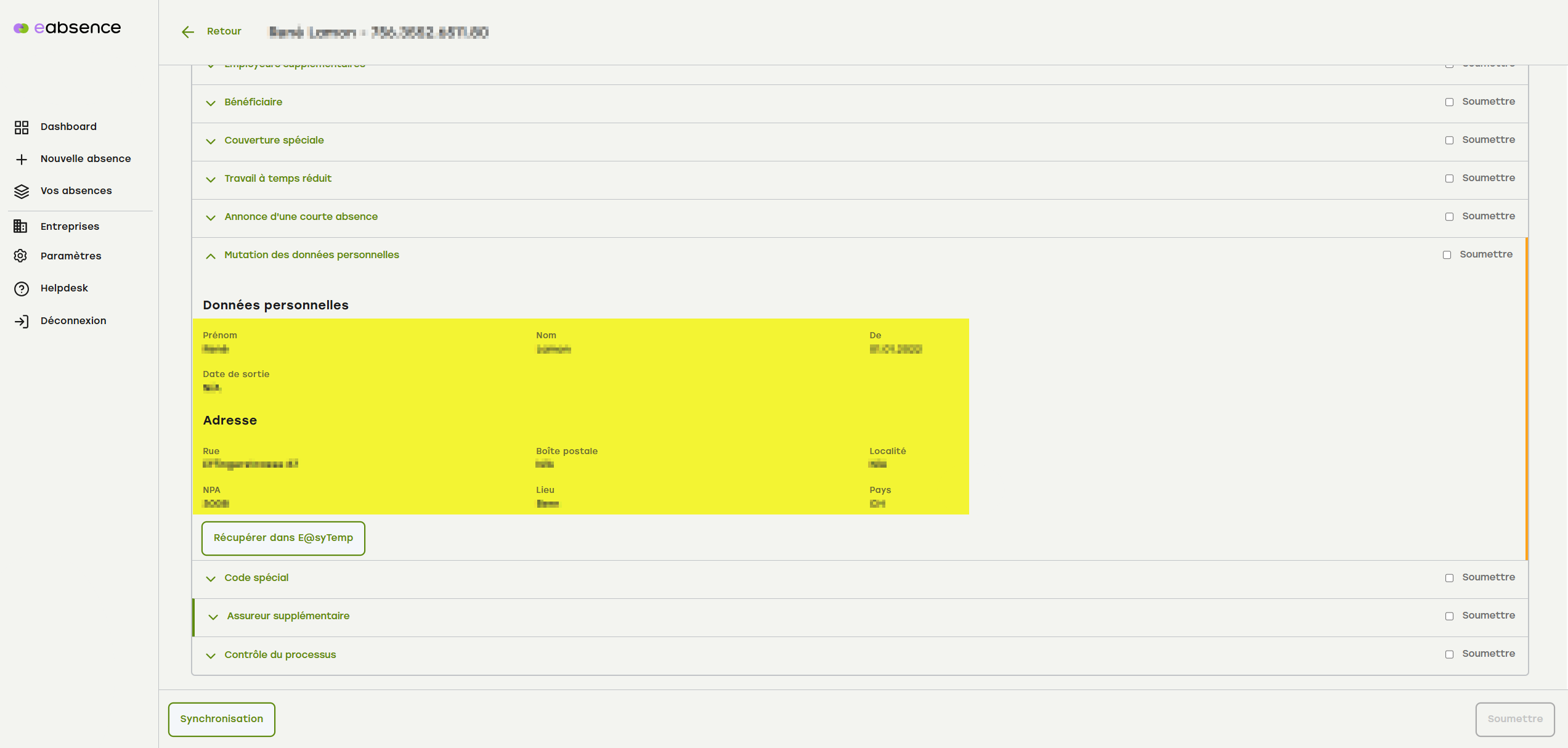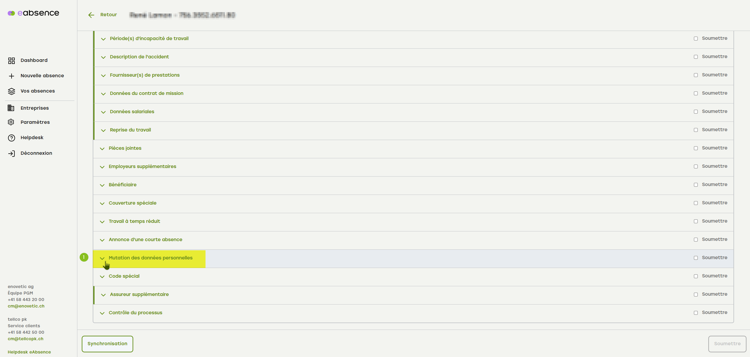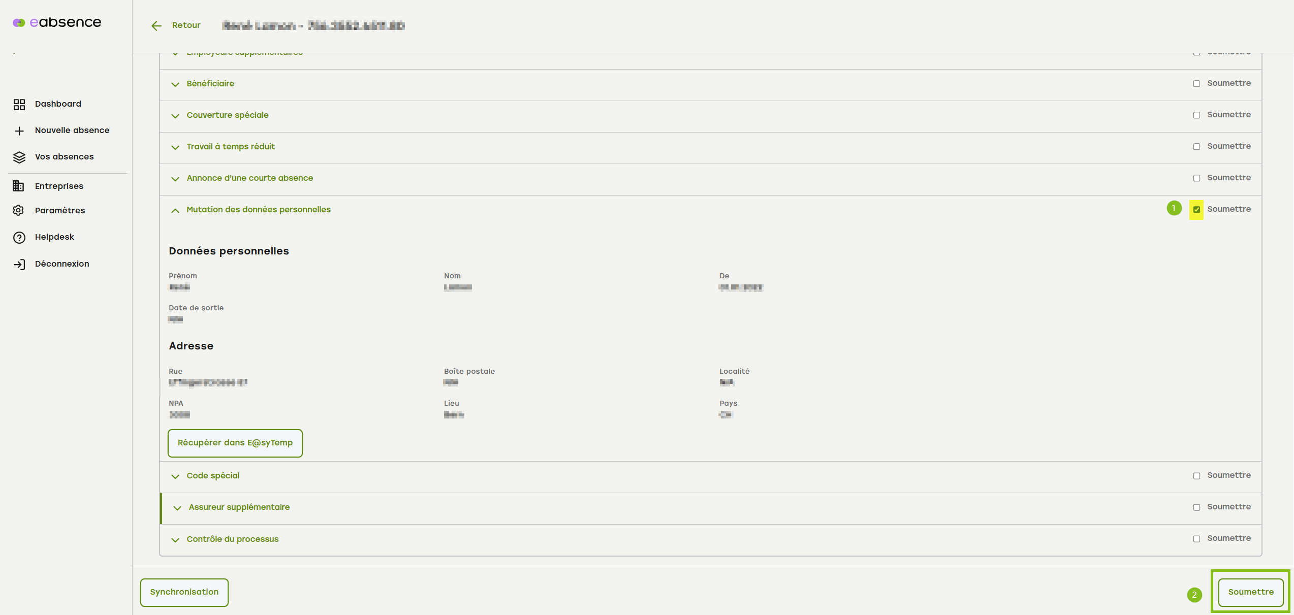 1. Ouvrez le menu accordéon « Mutation des données personnelles ».