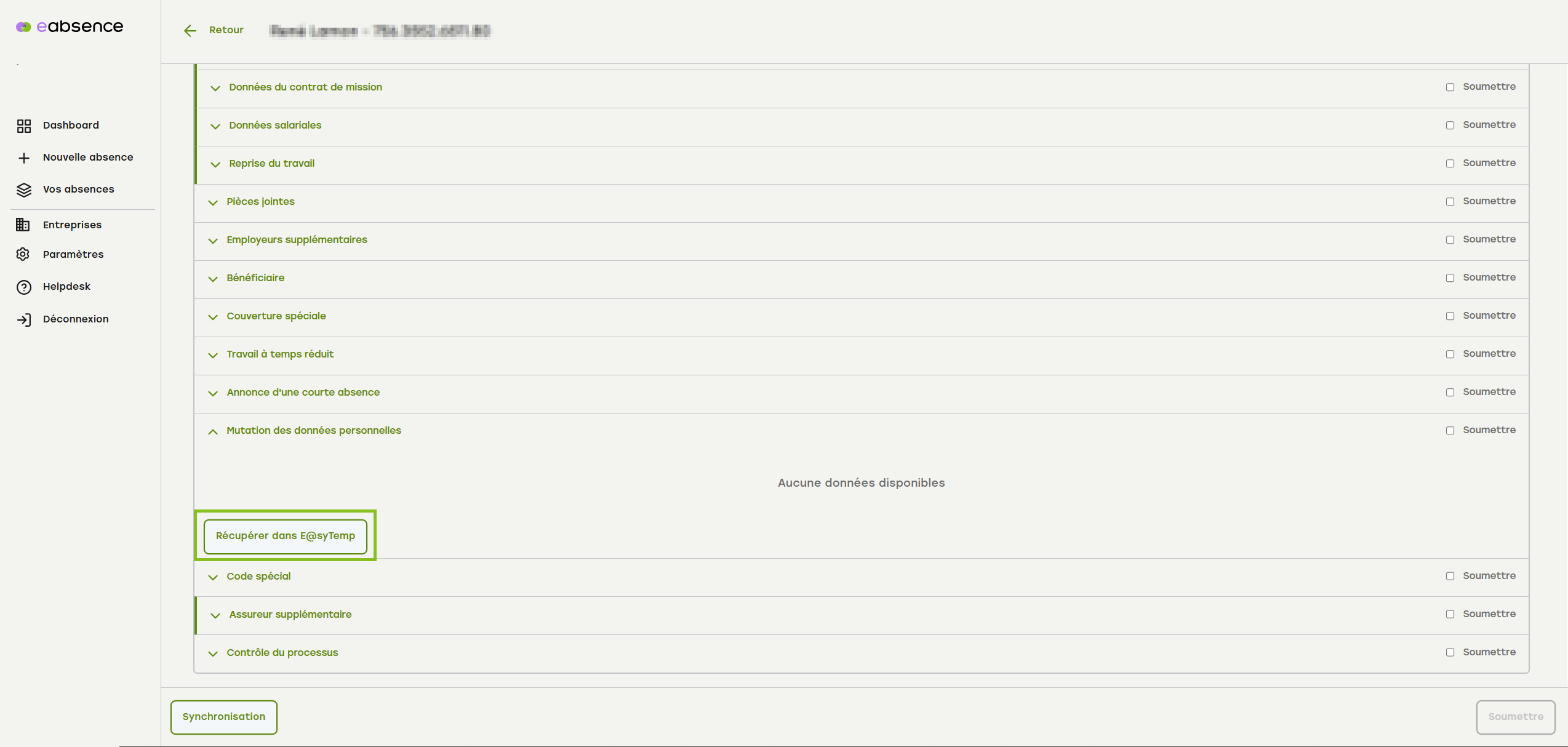 Recherchez le cas correspondant via le tableau de bord ou le menu « Vos absences ».