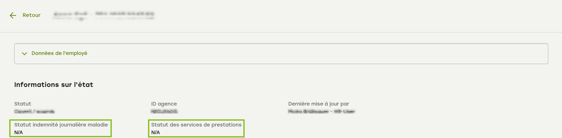 En cas de maladie et de prestations LPP, deux statuts s'affichent désormais dans la rubrique « Informations sur l'état » (statut des indemnités journalières maladie et statut des services de prestations) :