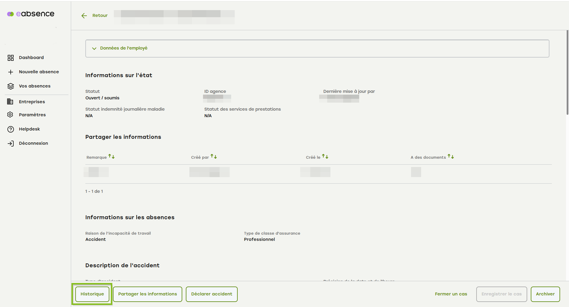 Vous avez maintenant la possibilité de consulter l'historique de votre absence. Pour cela, cliquez sur le bouton «Historique» afin d'obtenir plus de détails :