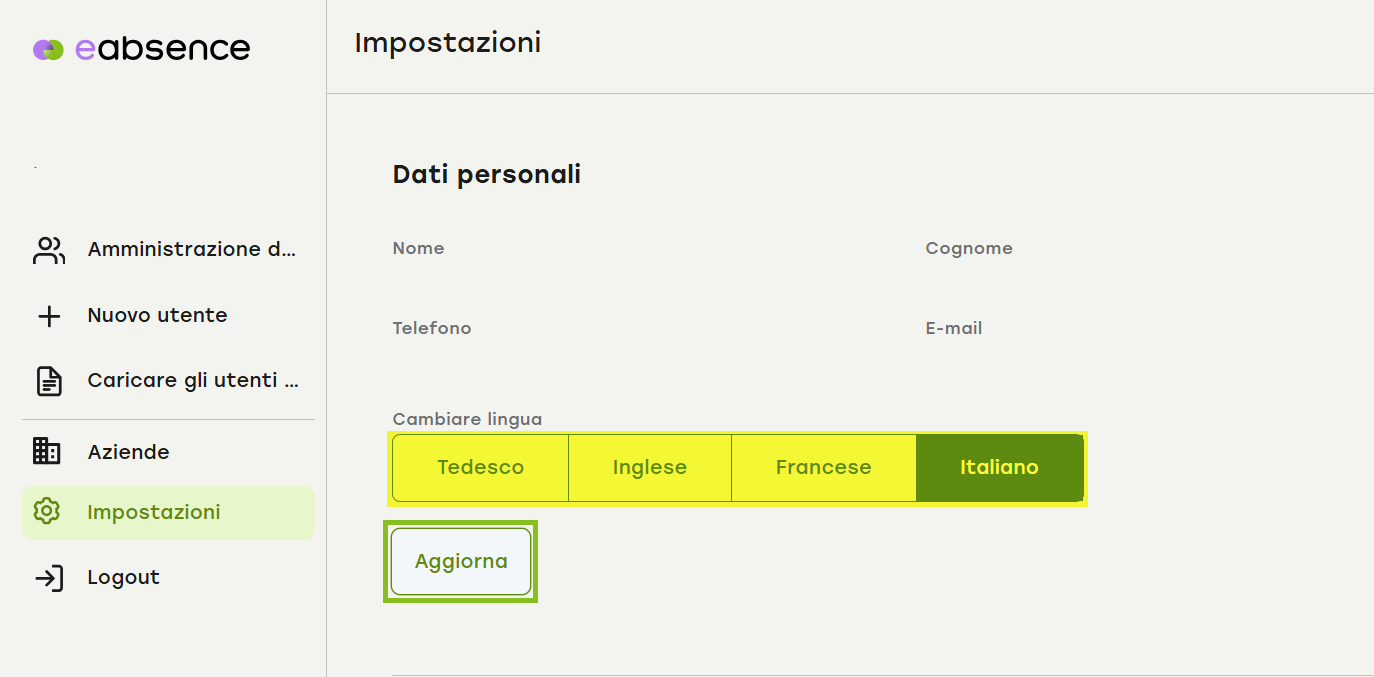 Selezionare la lingua desiderata nella sezione “Cambiare lingua” e cliccare su “Aggiorna”.