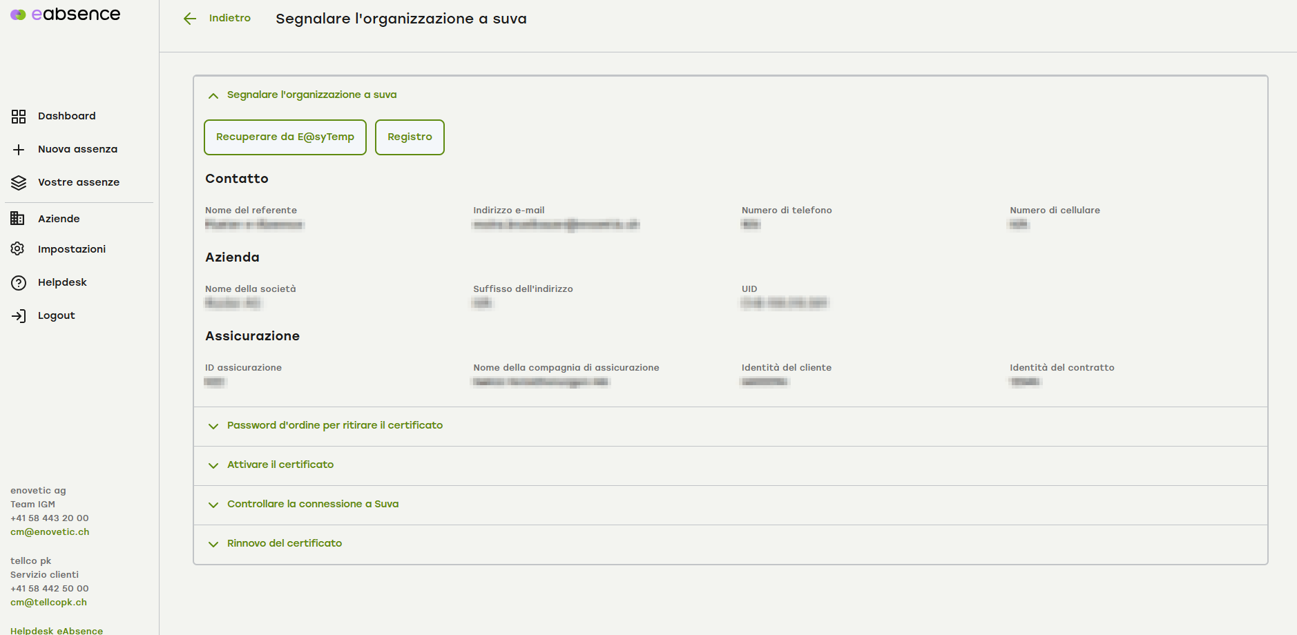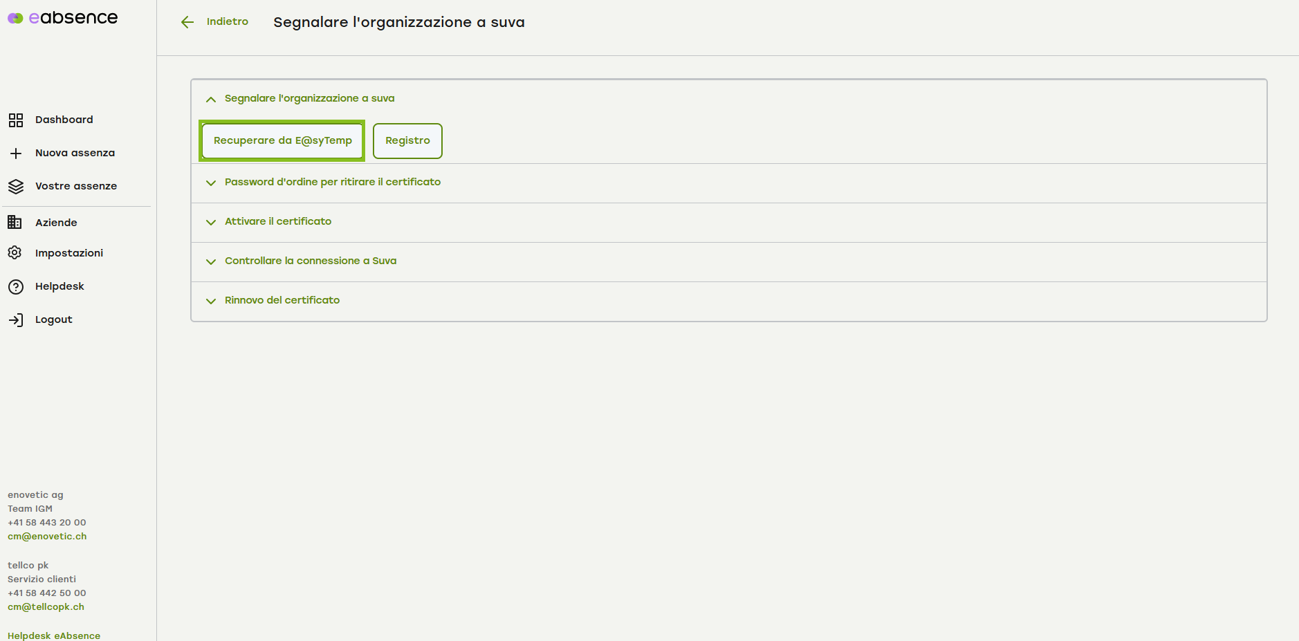 Clicca su «Richiedi in e@syTemp» per visualizzare i dati relativi all'organizzazione.