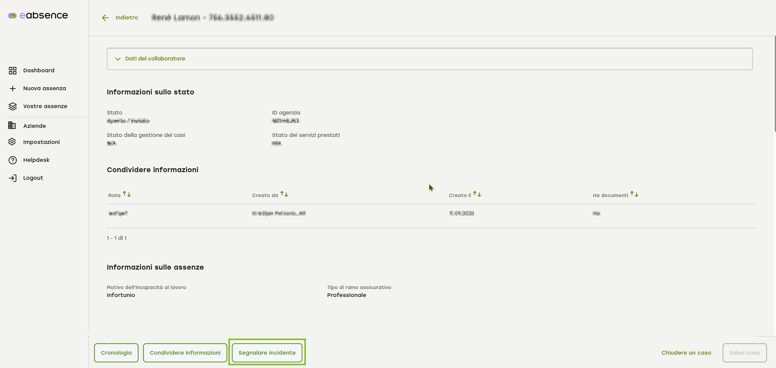Dopo aver registrato il nuovo caso in eAbsence (infortunio) (che ha un numero di caso eAbsence), aprite il caso e cliccate sul pulsante «Segnalare un infortunio» in basso.
