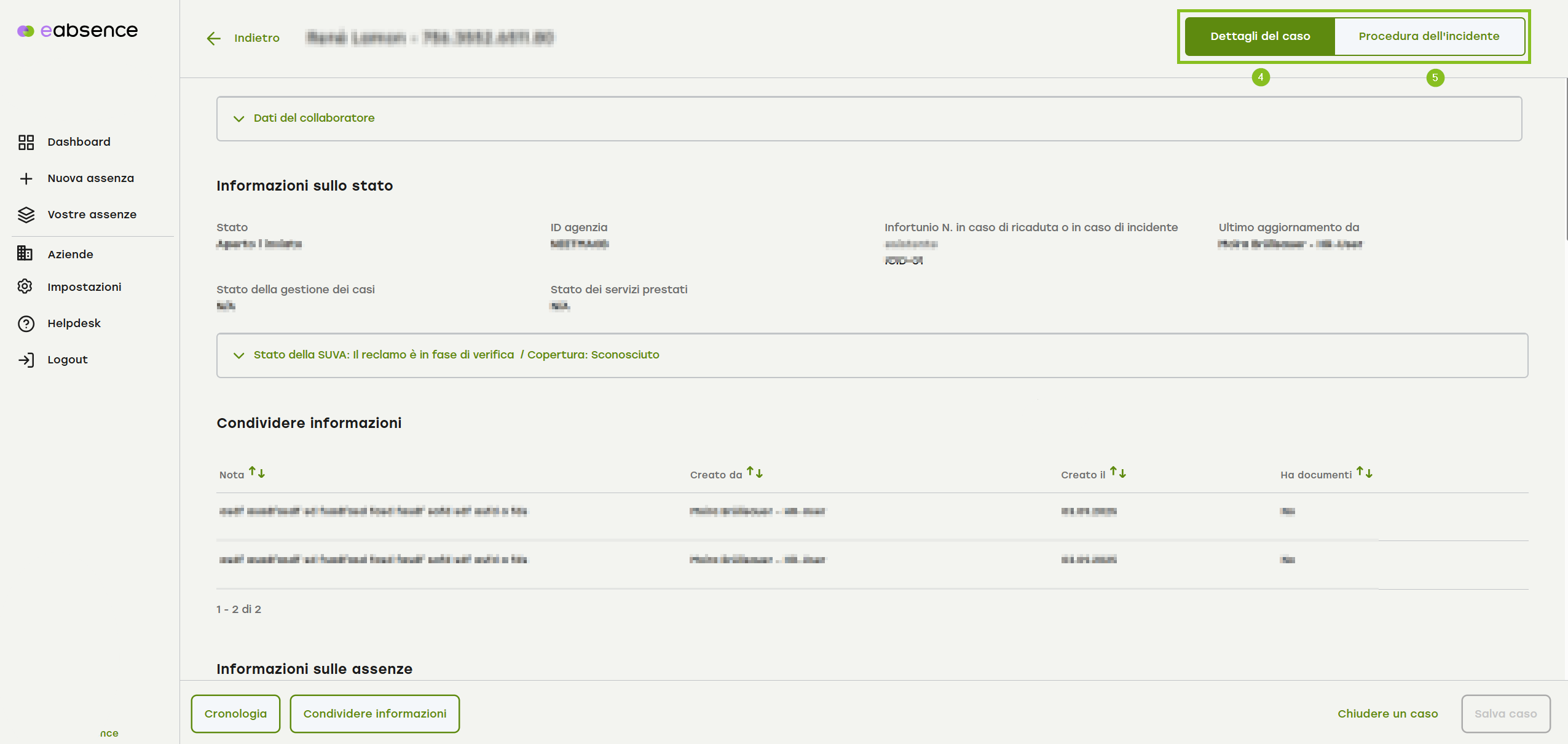 4. Nella sezione «Dati relativi al caso» troverete le informazioni sul collaboratore e sulla dinamica dell'infortunio che avete inserito voi stessi o che sono state recuperate dal sistema e@syTemp.