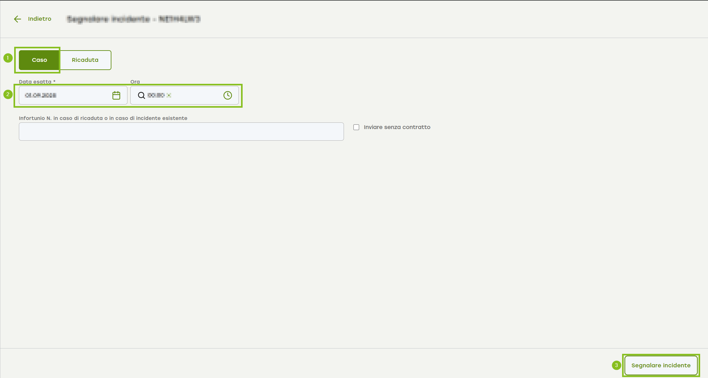 2. Inserite la data dell'infortunio nel campo della data e, se richiesto, anche l'ora dell'infortunio.