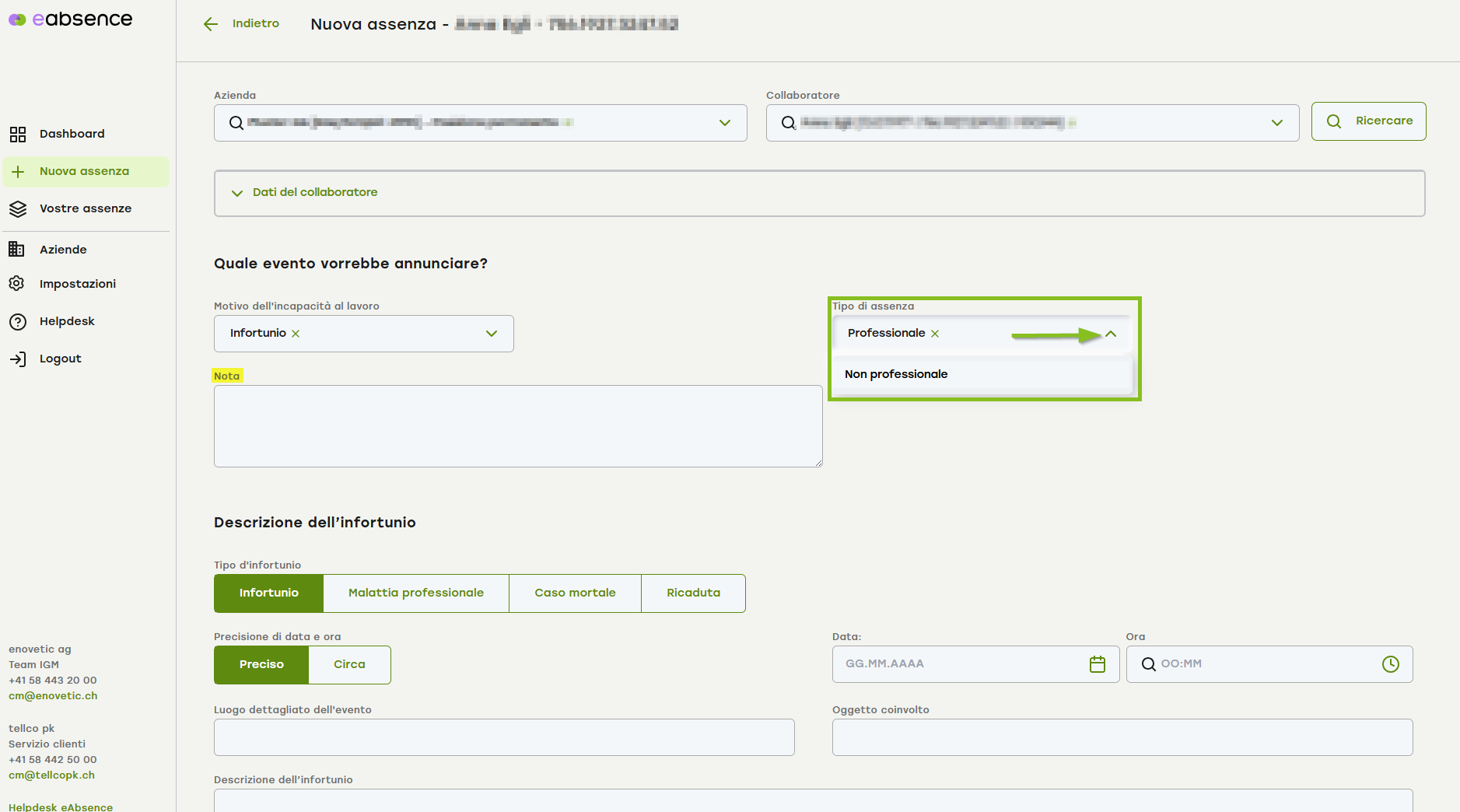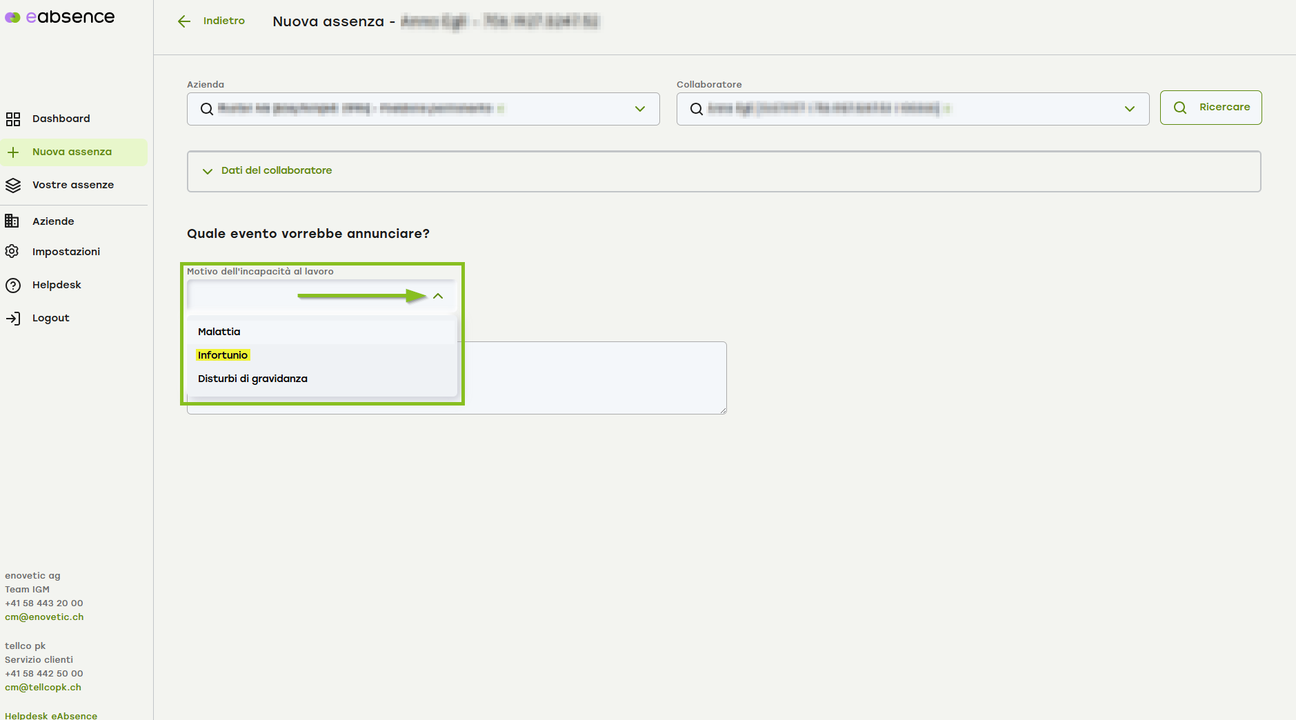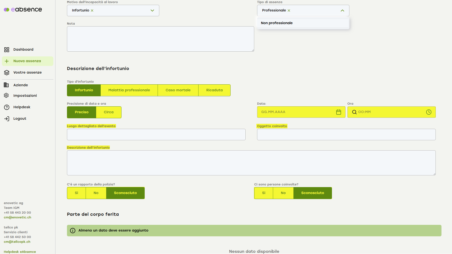 Specificare il tipo di assenza che si desidera registrare, in questo caso un infortunio.