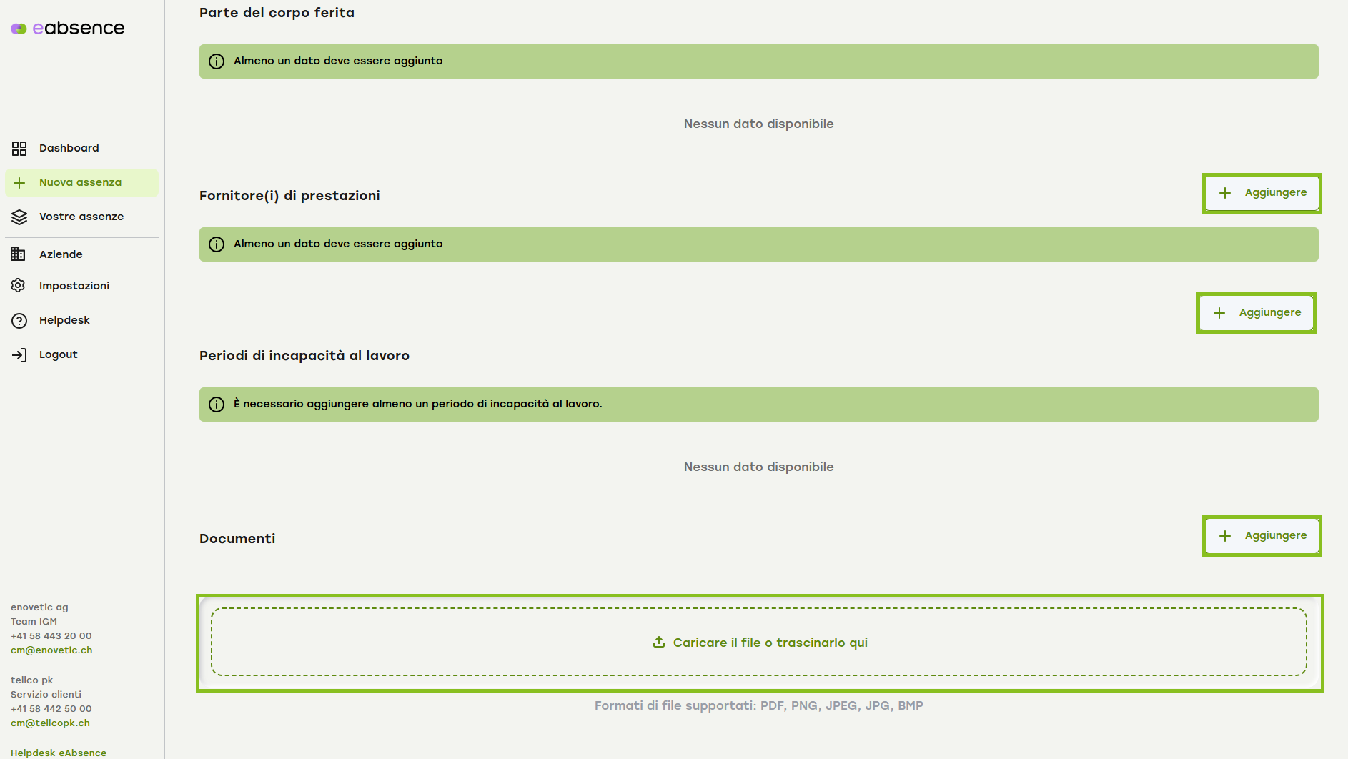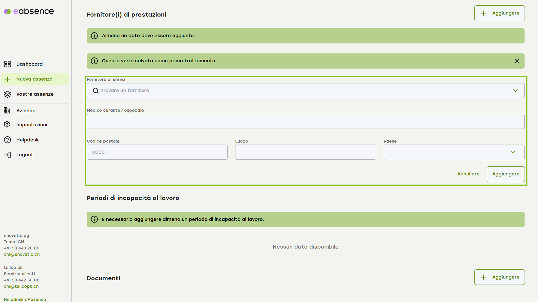 È necessario dichiarare il fornitore di servizi. Se l'infortunio comporta un'incapacità lavorativa (parziale), inserire il periodo o i periodi corrispondenti.