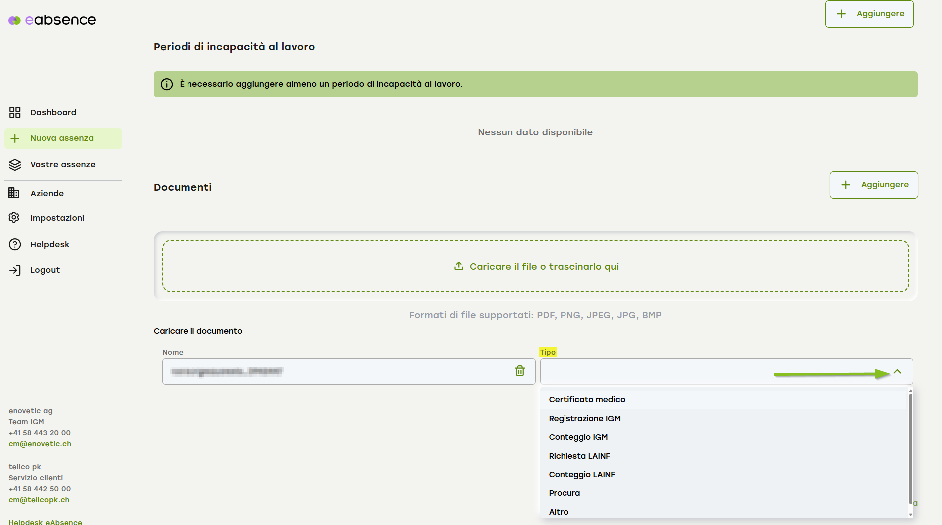 Caricare i file e selezionare il tipo di documento (colonna di destra). Nella colonna di sinistra è possibile rinominare i file, se necessario, per migliorare la chiarezza. Terminate il processo con “Aggiungi”.