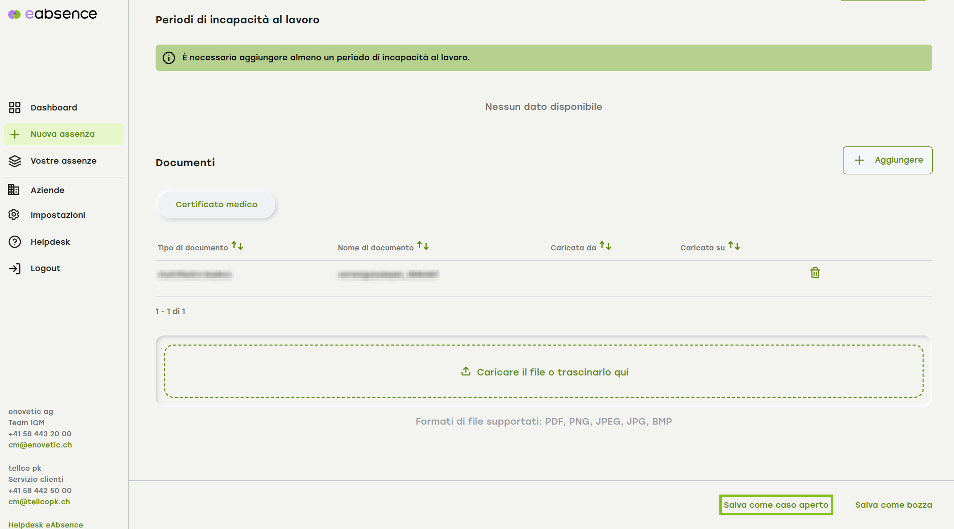 Inserire ora tutti i documenti pertinenti. È possibile trascinare uno o più file direttamente dal file manager o cliccare su “Carica file”. Formati di file supportati: PDF, PNG, JPEG, JPG, BMP.