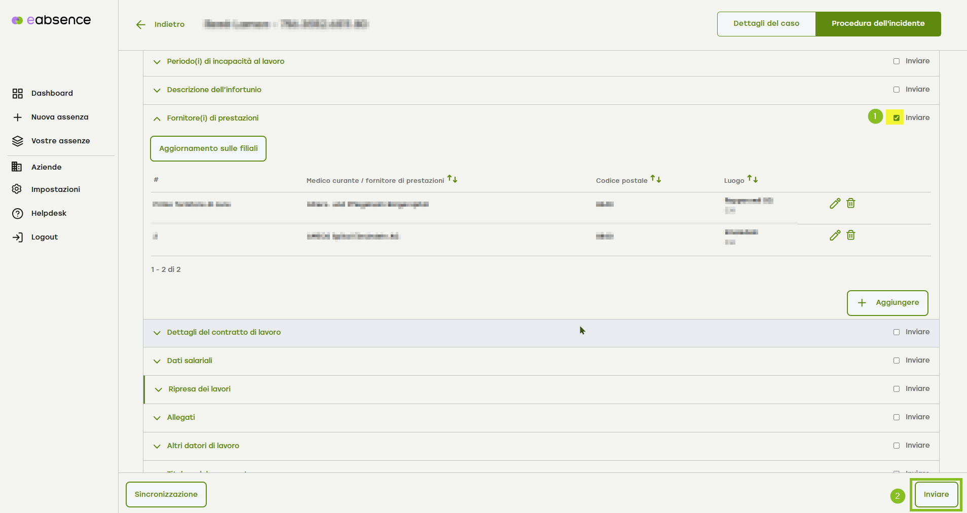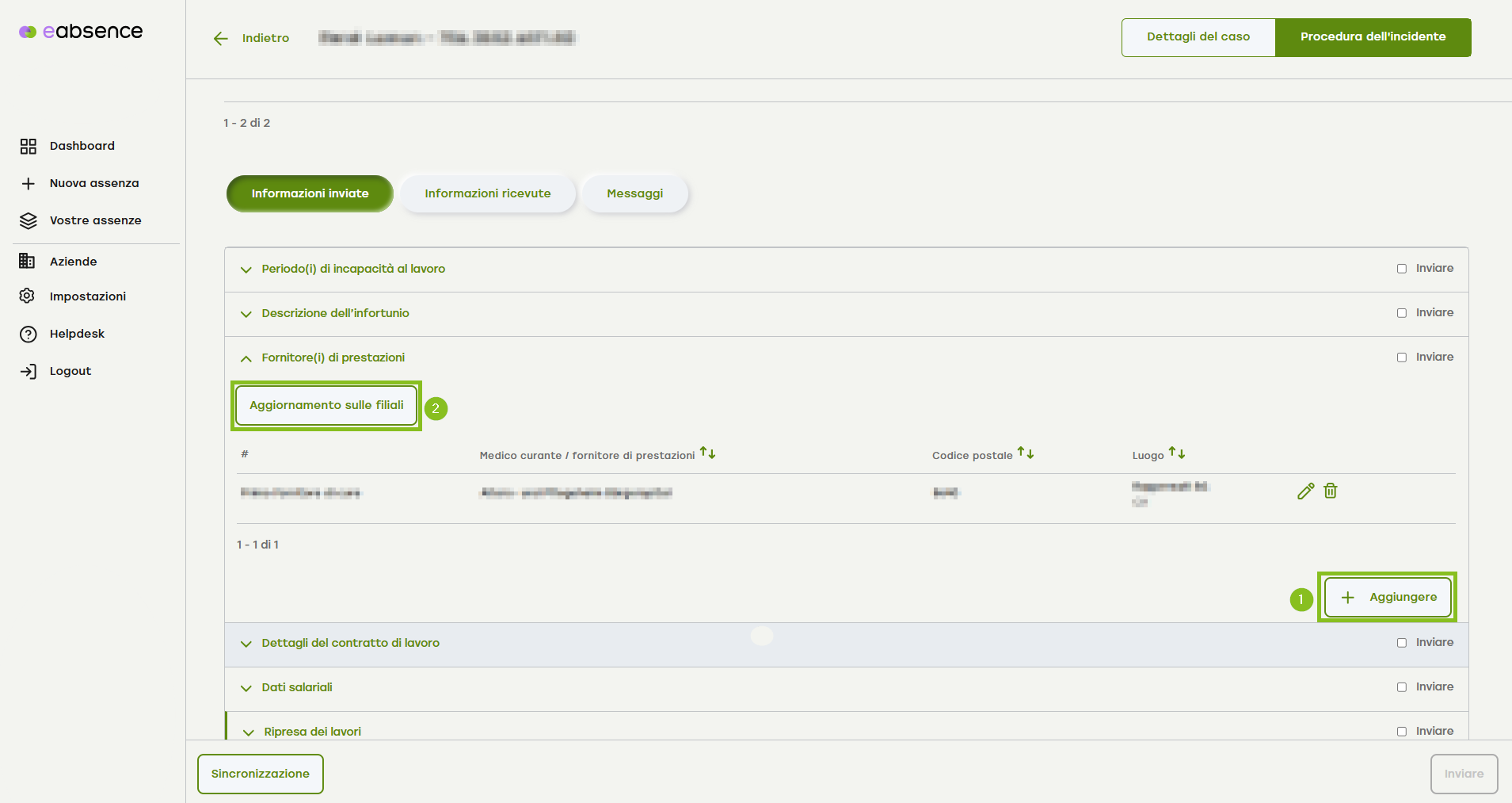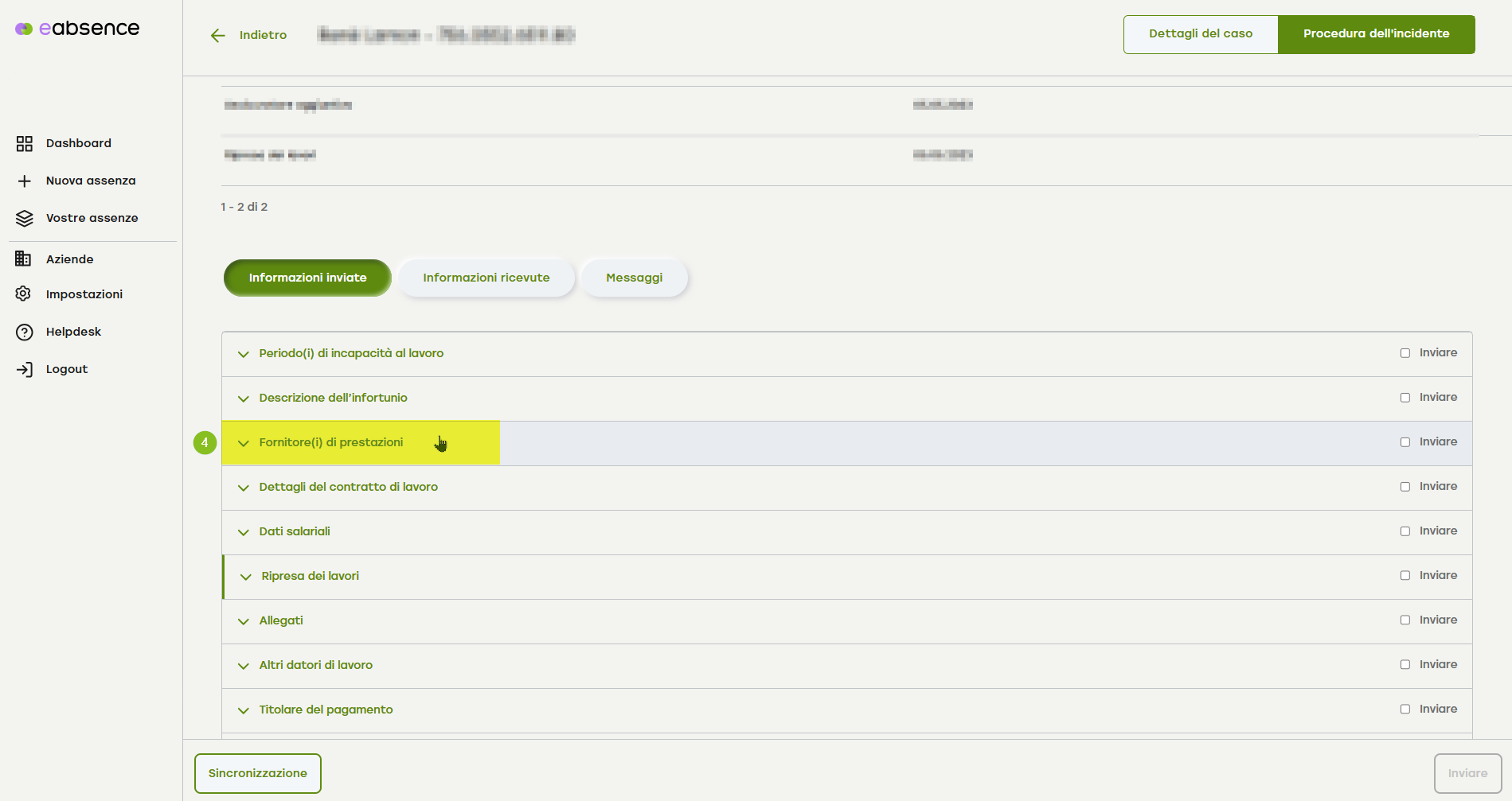 3. Dopo aver attivato il pulsante «Informazioni inviate», scorri verso il basso fino alla voce di menu a fisarmonica «Fornitore di prestazioni».