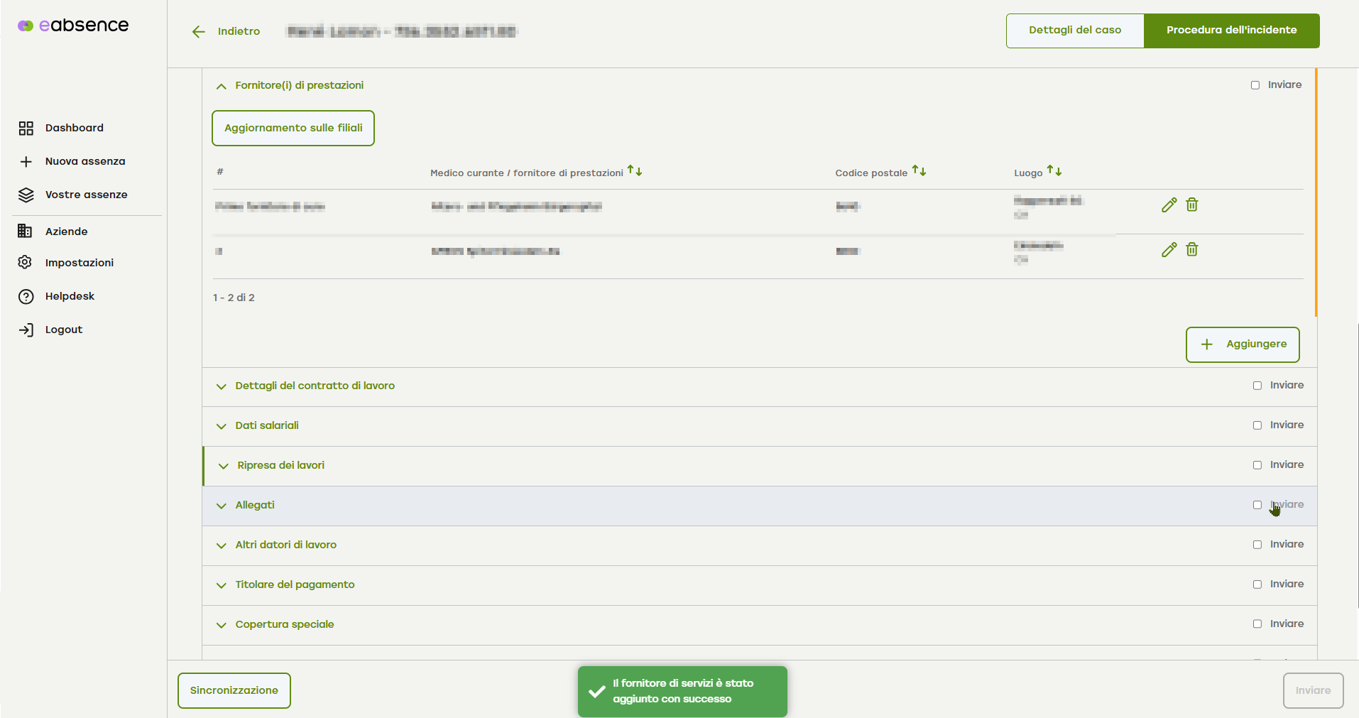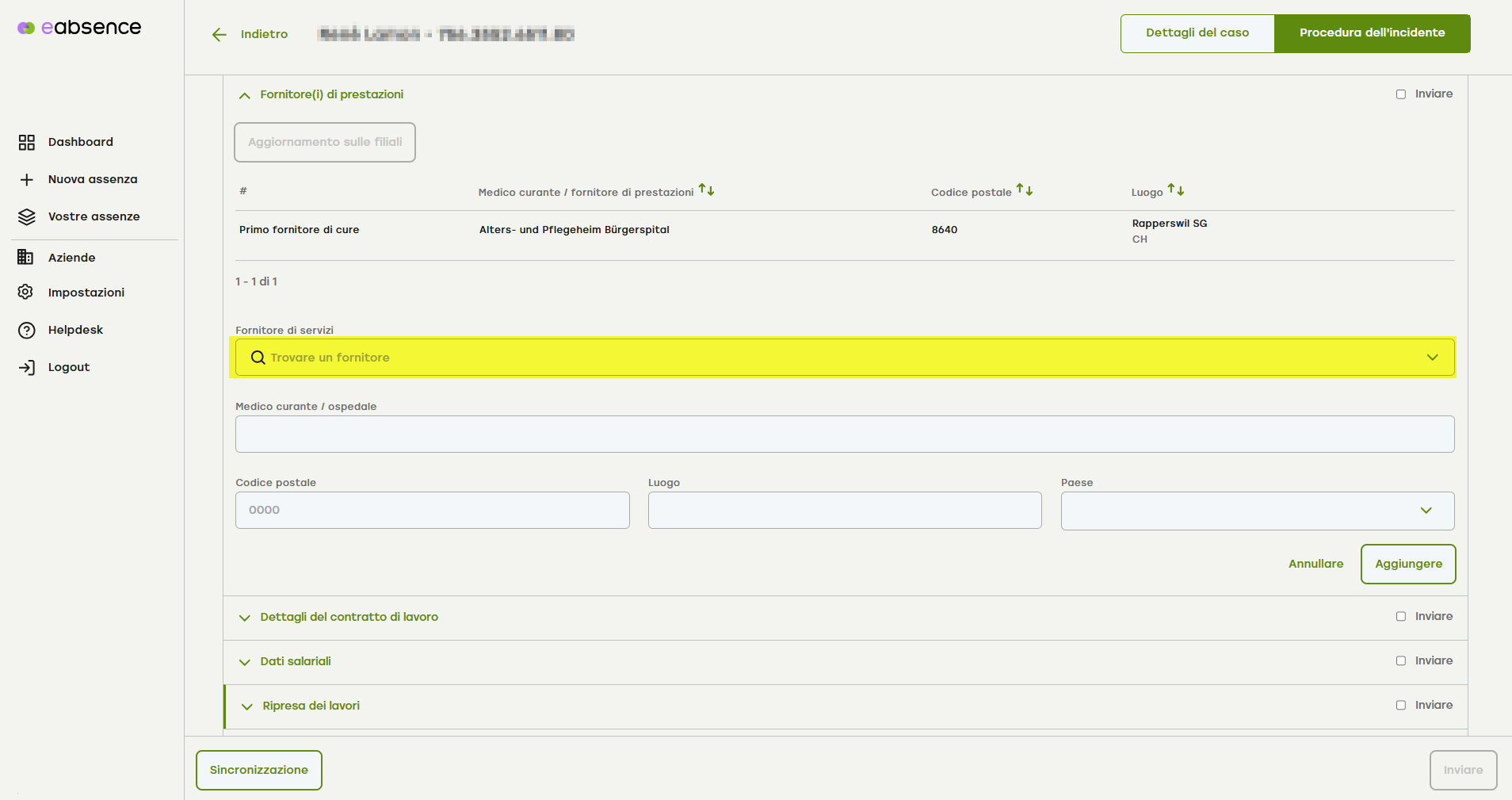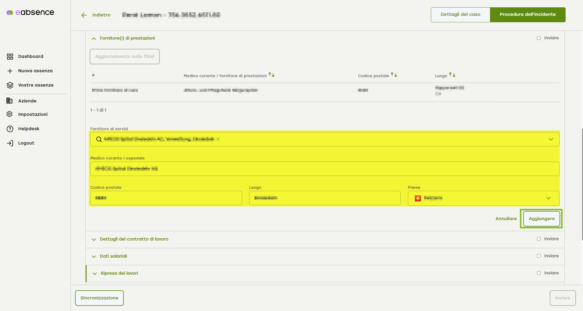 Controlla i dati relativi al fornitore di prestazioni e clicca su «Aggiungi».