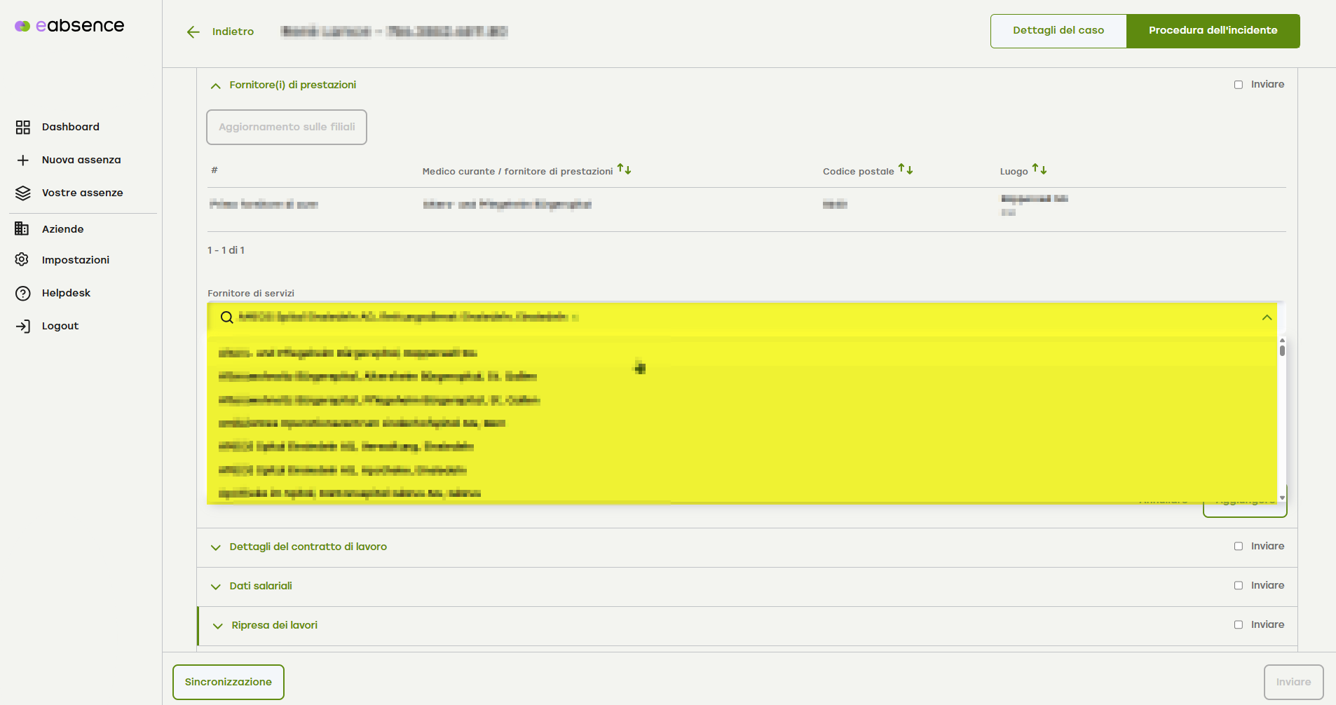 Dal menu a tendina può selezionare il fornitore di prestazioni appropriato.