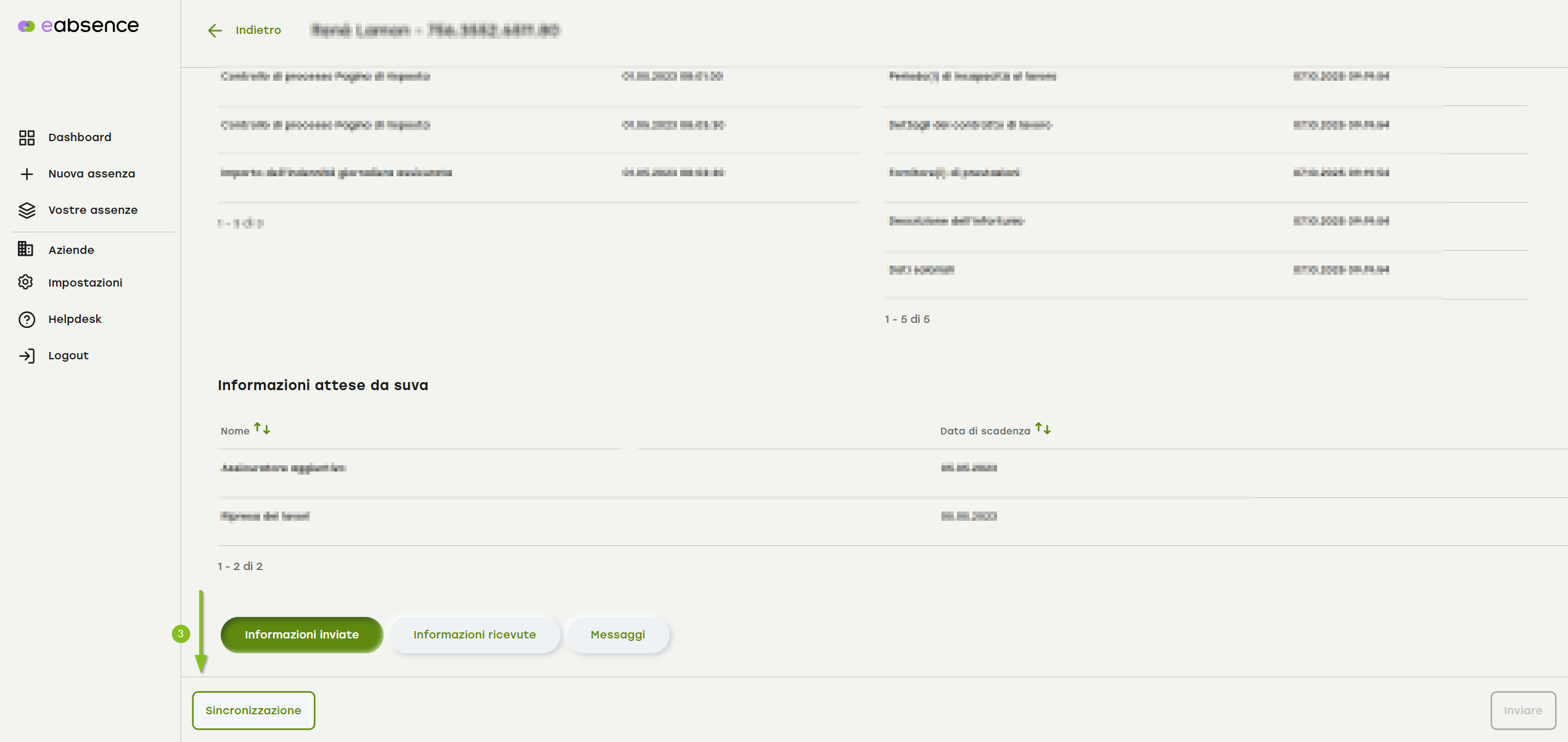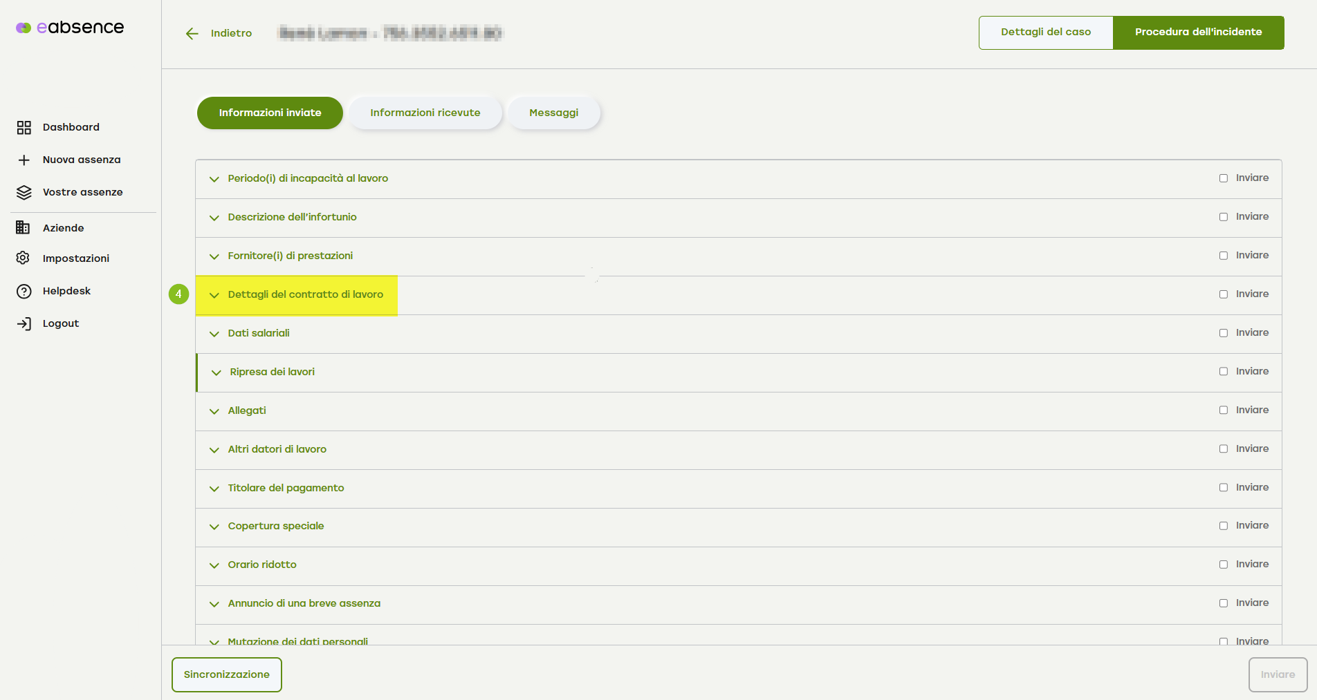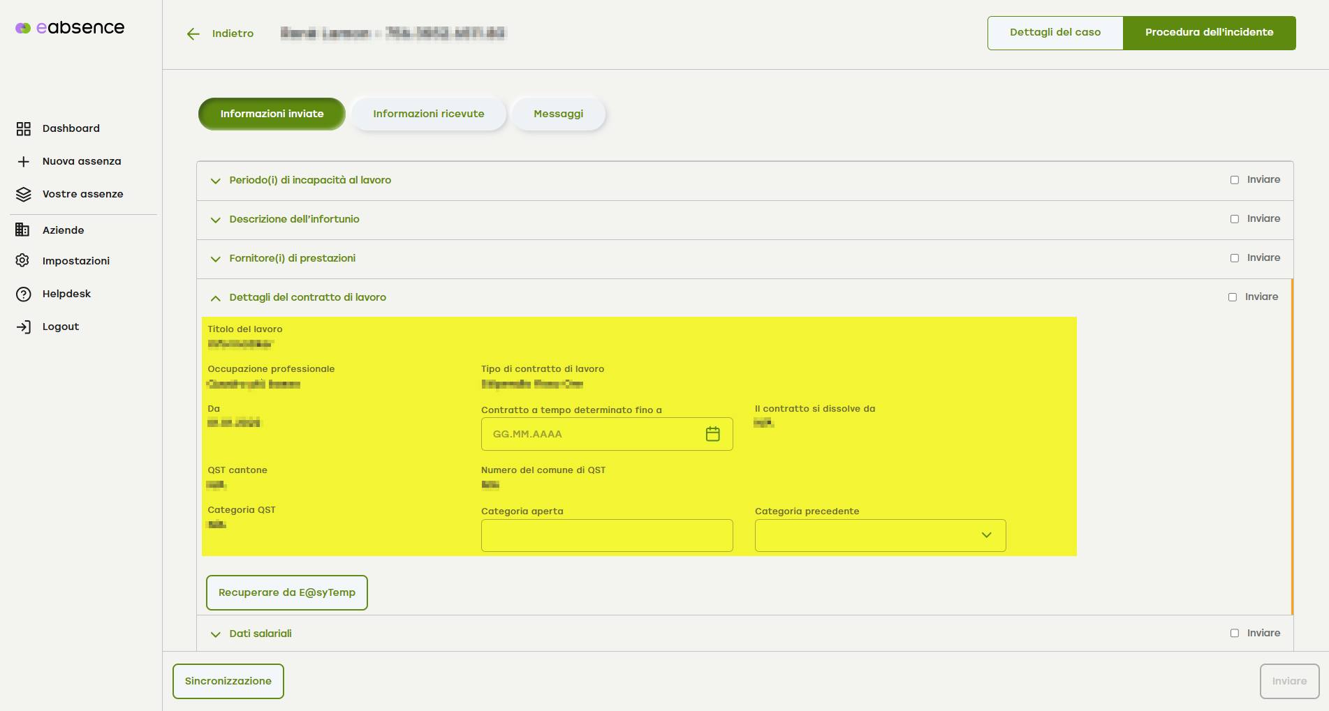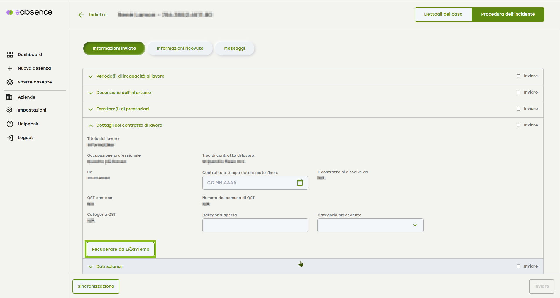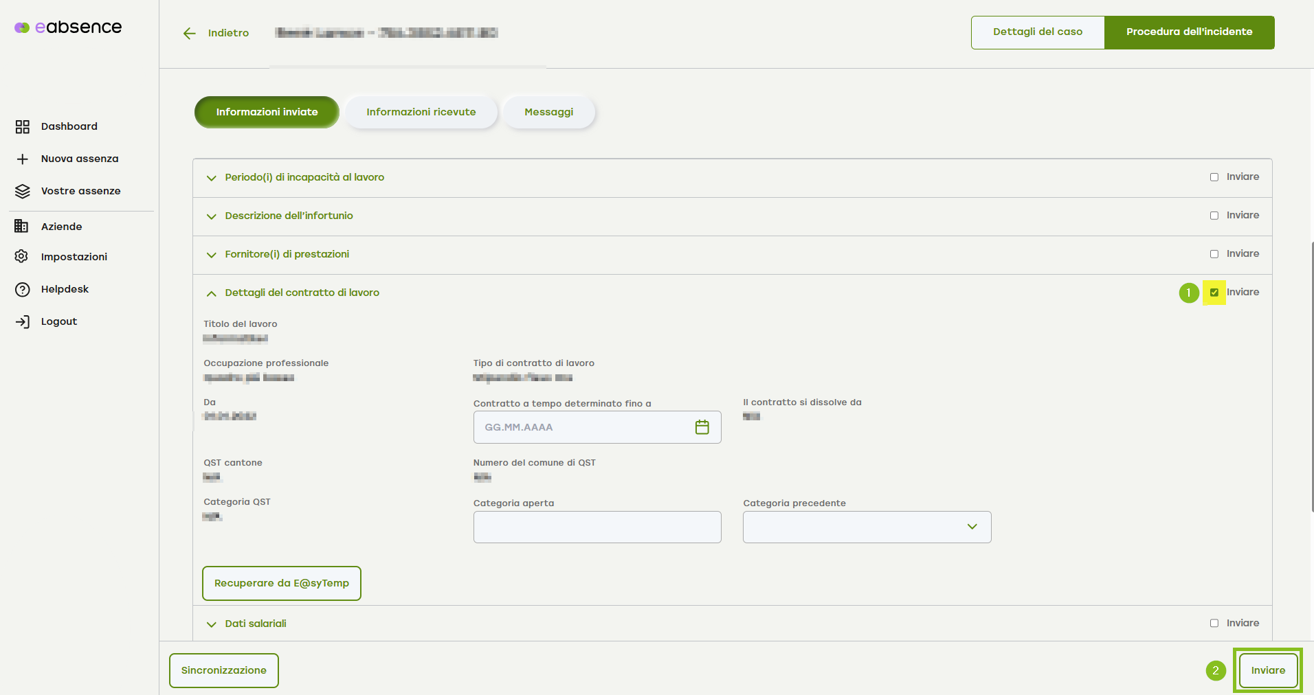 3. Dopo aver attivato il pulsante «Informazioni inviate», scorri verso il basso fino alla voce di menu a fisarmonica «Dettagli del contratto di lavoro».
